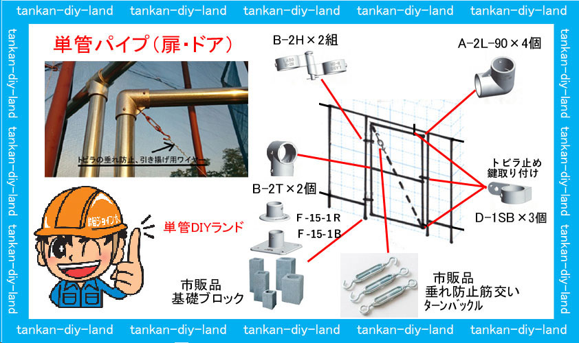 単管パイプ扉の造り方・・・①垂れ防止のターンバックルでの筋交い ②トビラのストッパー(トビラ止め)