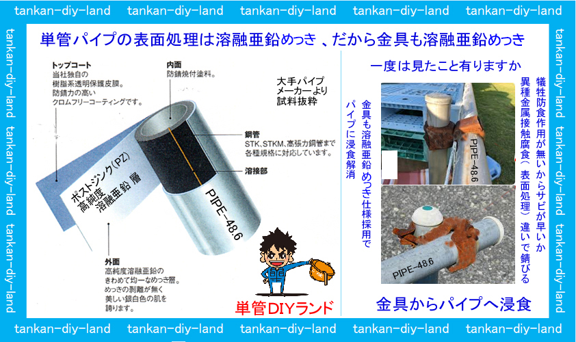 めっきの違い(電気めっきと溶融亜鉛めっき)で金具から侵食パイプもいずれ錆びが広がる。(参考資料)