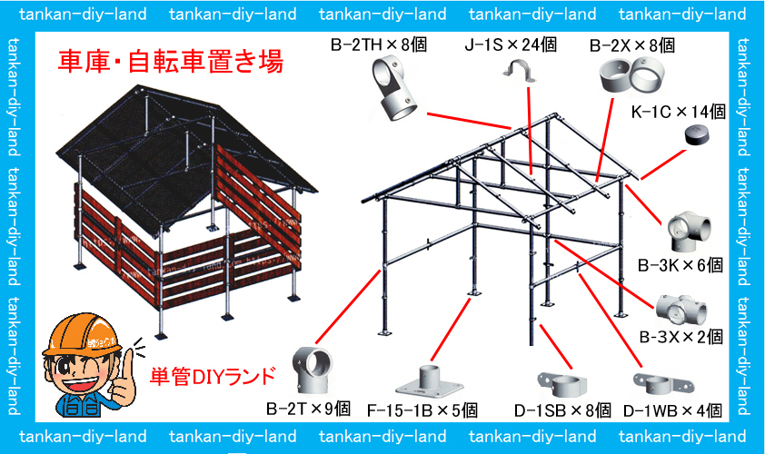 車庫、自転車置き場の「組み立て参考図」のページで、更に細かい画像で組立方法も紹介しています!