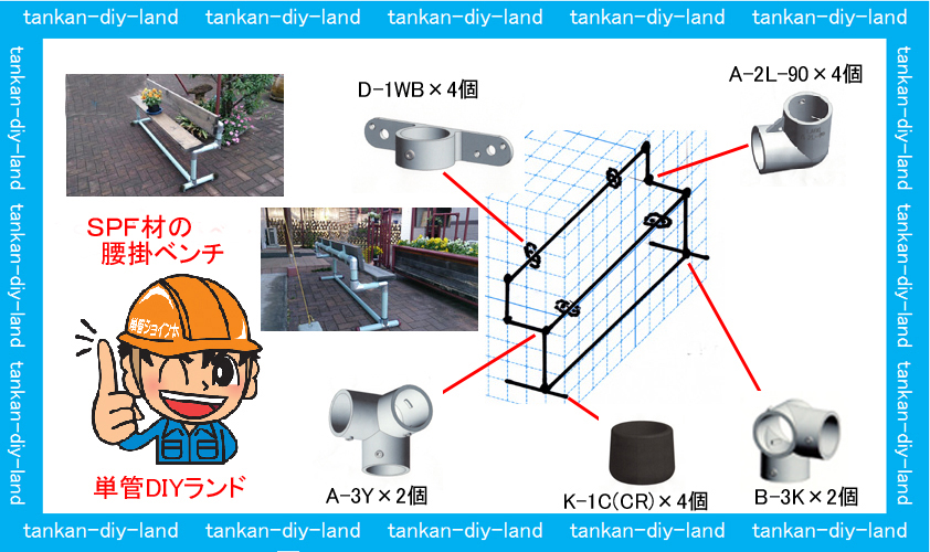 SPF材腰掛の単管パイプベンチに使用できる。LABO金具