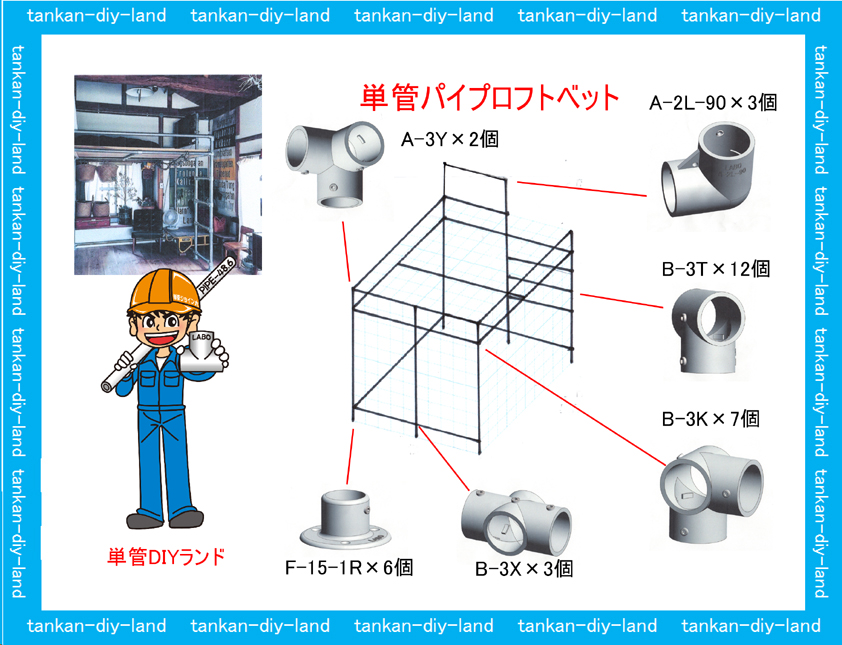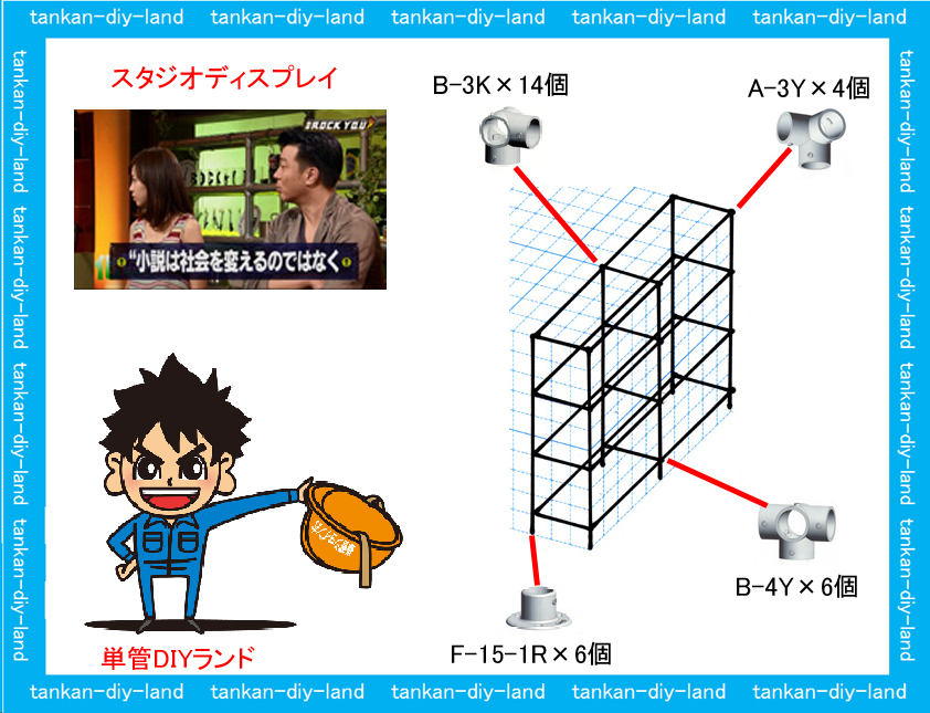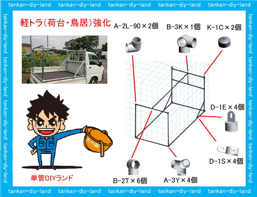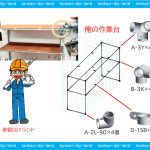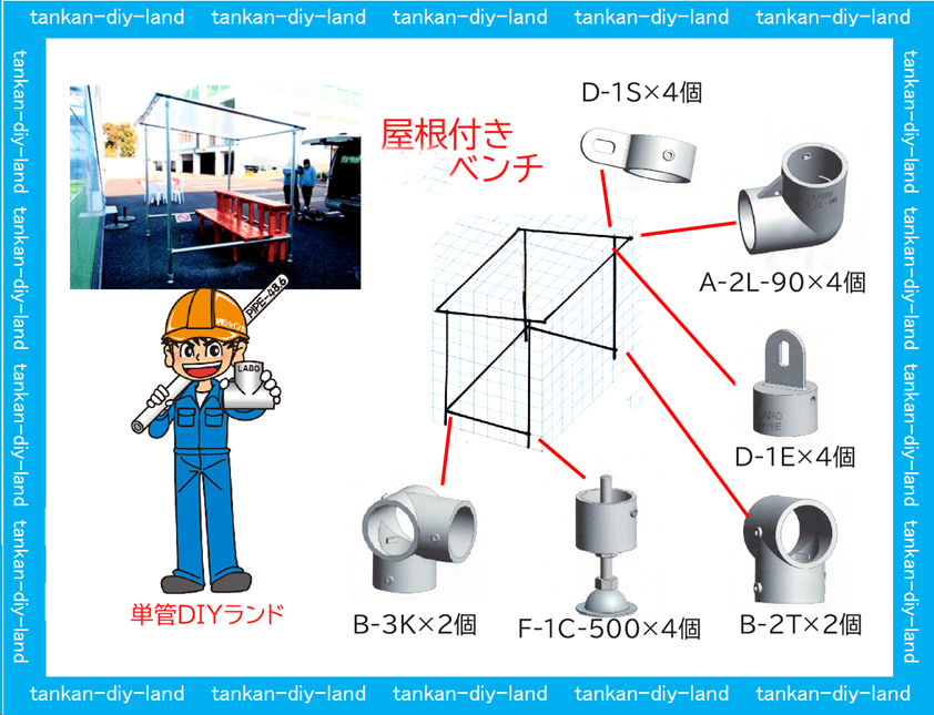単管パイプ工作こんなLABO金具を使って作れます。(画像をクリックすると大きくなります)アイソメ図から立体で分かりやすく解説