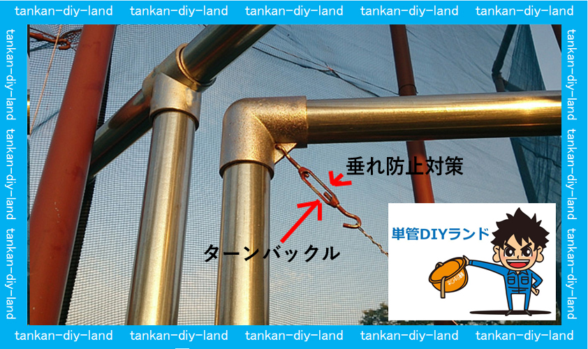 単管パイプ扉の造り方・・・①垂れ防止のターンバックルでの筋交い ②トビラのストッパー(トビラ止め)