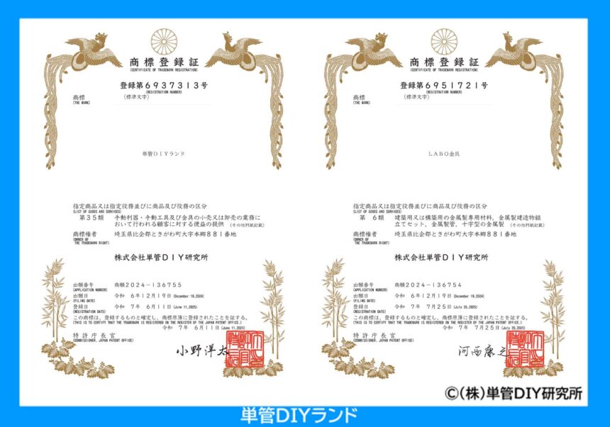 本日は、皆様にご報告したいことがあります。この度、私たちが運営するウェブサイト・ショップ名である「単管DIYランド」と、オリジナル製品の単管パイプジョイント「LABO金具」が、正式に特許庁により商標登録を完了しました!