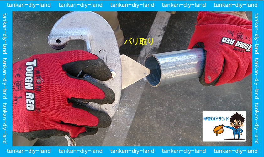 電動の高速カッター・万力を使用せずに、手回しの手動カッターと4方向1箇所貫通金具(B-3X)を使用してパイプカットしました!!