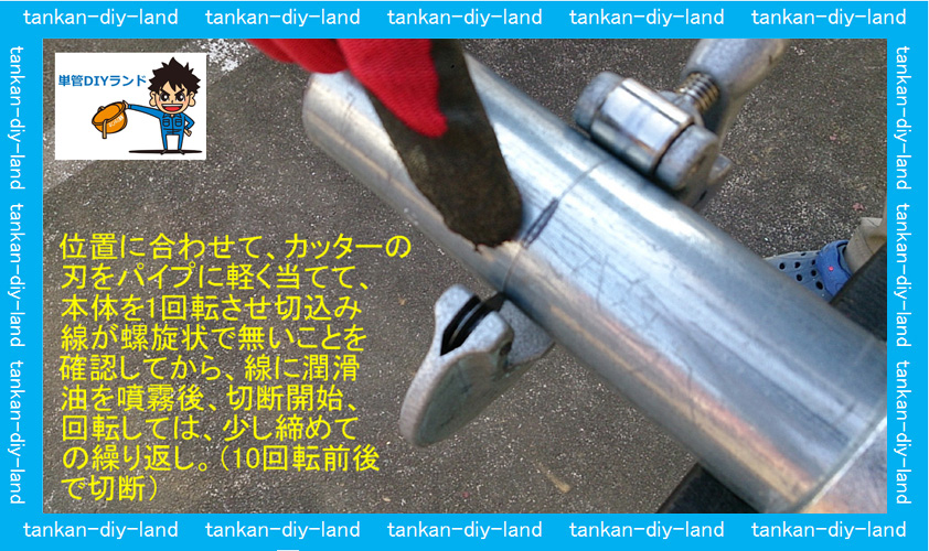 刃をパイプに軽く当てて、本体を1回転させて切込み線が螺旋状で無いことを確認してから切断開始。