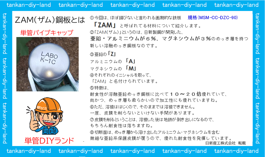 単管パイプキャップのZAN(ザム)鋼板とは(ほぼ錆びないと言われる画期的な鉄板)単管パイプとほぼ同じ材質です。