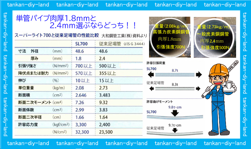 単管パイプの機械的性質(肉厚1.8mmと2.4mm)比較 (国内パイプメーカー様の資料の転載)