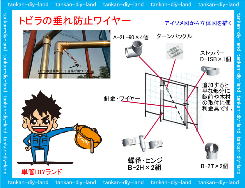 単管パイプ継手DIY工作の『サンプルチャート』アイソメ立体図