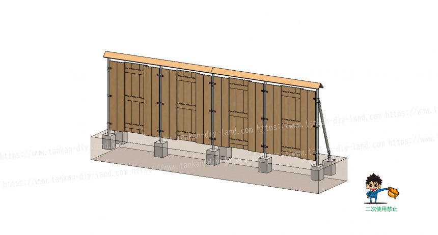 ※ 風などの強い地域では横板を多くする、単管パイプへ変更するなど飛ばされないように設置してください。